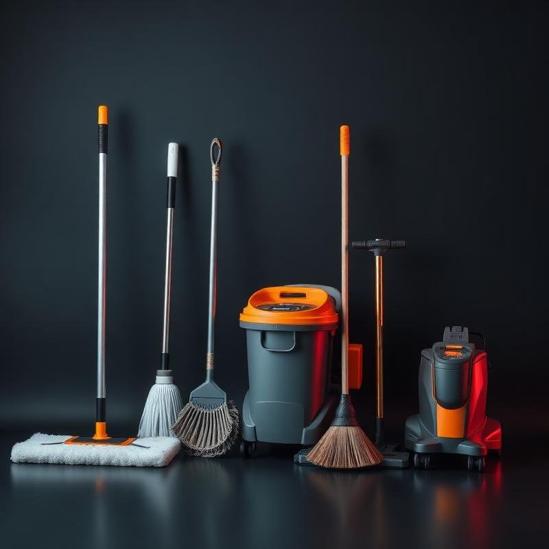 Mops, vassouras, rodos e máquinas profissionais de limpeza industrial.